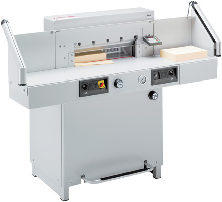 520 mm Schnittlänge. Elektro-mechanischer Messerantrieb. Hydraulischer Antrieb für Pressbalken. Stufenlos regelbarer Pressdruck (min. 200 daN, max. 1100 daN) mit Anzeige über Manometer. Fußpedal zum Vorpressen oder als Schnittandeuter. Pressbalkenabdeckung. Elektrisch betriebener Rückanschlag mit professioneller Programmsteuerung. Elektronisches Handrad mit stufenlos regulierbarer Geschwindigkeit für manuelle Rückanschlag-Feineinstellung. Optischer Schnittandeuter mit leuchtstarken Leuchtdioden (LEDs). Pressbalken beidseitig geführt für gleichmäßigen Pressdruck. Präzisions-Rückanschlagspindel. Justierbarer Rückanschlagrechen mit enger Teilung (32 mm) und Kunststoffgleitern. Je zwei Seitenanschläge auf dem Vorder- und Rücktisch. Vollstahl-Messerträger und nachjustierbare Messerführungen. Hochwertiges Messer aus Qualitäts-Messerstahl. Zusatztische (2 Stück) gegen Aufpreis lieferbar.
