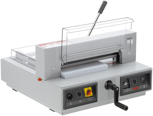 Elektro-mechanischer Messerantrieb. Schneidet Papierstapel (ca. 500 Blatt Papier 70 g/m²) oder gebundene Broschüren bis 40 mm Höhe. Hochwertiges Messer aus Qualitäts-Messerstahl. Vollstahl-Messerträger. Gehärtete, einstellbare Messerführungen. Patentierte Hebelschnellpressung. Präziser Seitenanschlag. Spindelgeführter Rückanschlag mit Handkurbel. Elektronisches Display für Digital-Maßanzeige, umstellbar von cm auf Zoll. Optischer Schnittandeuter mit leuchtstarken LEDs. Stabile Ganzmetall-Konstruktion. Lieferbar als Tischgerät; Untergestell oder Unterschrank mit Fachboden (drehbar) gegen Aufpreis.