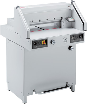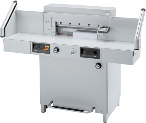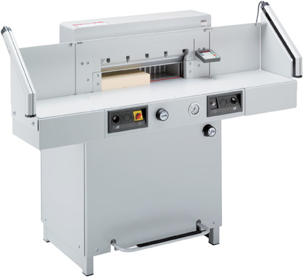 520 mm Schnittlänge. Elektro-mechanischer Messerantrieb. Hydraulischer Antrieb für Pressbalken. Stufenlos regelbarer Pressdruck (min. 200 daN, max. 1100 daN) mit Anzeige über Manometer. Fußpedal zum Vorpressen oder als Schnittandeuter. Pressbalkenabdeckung. Elektrisch betriebener Rückanschlag mit professioneller Programmsteuerung. Elektronisches Handrad mit stufenlos regulierbarer Geschwindigkeit für manuelle Rückanschlag-Feineinstellung. Optischer Schnittandeuter mit leuchtstarken Leuchtdioden (LEDs). Pressbalken beidseitig geführt für gleichmäßigen Pressdruck. Präzisions-Rückanschlagspindel. Justierbarer Rückanschlagrechen mit enger Teilung (32 mm) und Kunststoffgleitern. Je zwei Seitenanschläge auf dem Vorder- und Rücktisch. Vollstahl-Messerträger und nachjustierbare Messerführungen. Hochwertiges Messer aus Qualitäts-Messerstahl. Zusatztische (2 Stück) gegen Aufpreis lieferbar.
